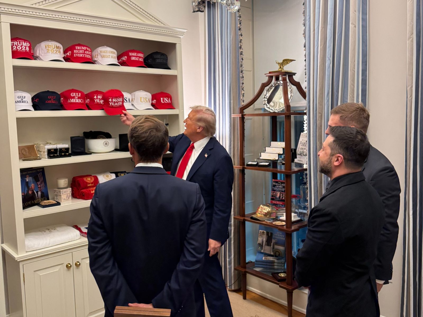 根據《福斯新聞》報導,川普在會談期間向澤倫斯基、馬克宏等人展示自己的收藏,照片中,可見川普站陳列櫃前,特別拿起一頂紅色「再幹4年」的帽子,櫃上還有許多帽子,包含印有「川普2028」「讓美國再次偉大」「美國灣」「川普說什麼都是對的」等字詞的棒球帽,還有去年他被槍擊的那張經典照片。