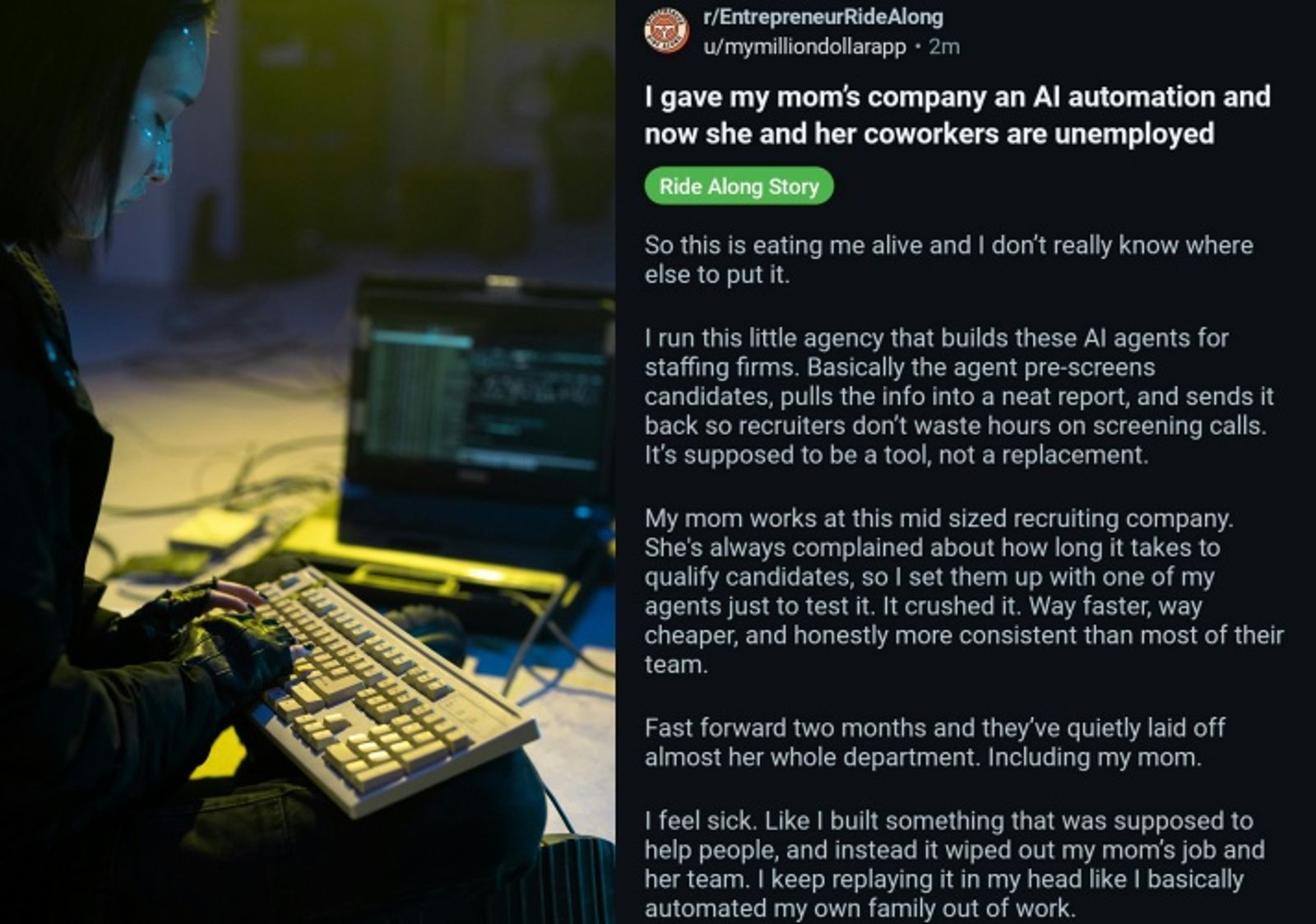 這篇貼文迅速在 Reddit「r/EntrepreneurRideAlong」引爆討論。有網友懷疑這是「打著故事的軟性行銷文」,也有人指出,無論真假,它都揭示了AI帶來的殘酷現實──企業若缺乏配套措施,AI很可能加劇就業不安,甚至取代整個部門。