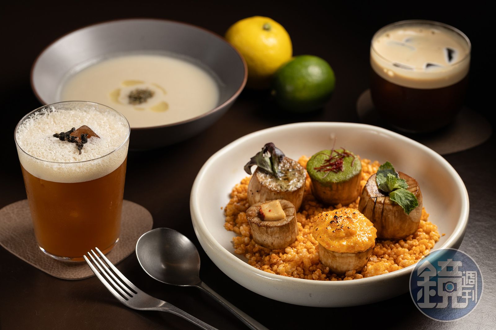 「嫩煎干貝五味」(右前,350元/份)以杏鮑菇仿製干貝口感;「檸香薄荷白花椰」(左後,300元/份)蘊含堅果奶油香氣;「荔枝鐵觀音美式」(左前,210元/杯)與「雲霧冰美式」(右後,160元/杯)是中午用餐時段的人氣飲品。「蘑菇黃扁豆綠咖哩燉飯」透過香茅、檸檬葉、青龍椒等原型食材調製出獨特的風味與顏色,米飯在煮製過程中特別講究清洗方式與軟硬度,層次豐富。(480元/份)這樣的細節設計,也延伸到飲品,請來曾任職亞洲50大酒吧的調酒師Chris坐鎮,每款調酒象徵地球不同狀態,「過去」的濃烈、「現在」的焦灼、「未來」的反思;這些酒,不只是飲品,更像一場意象式的環境寓言。