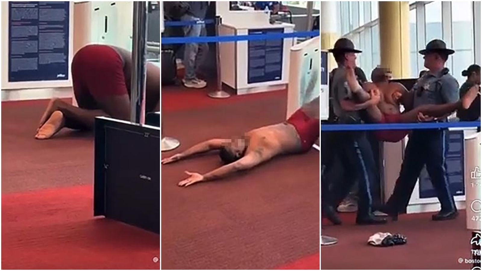 從網友馬利(Camie Marie)拍下分享在社群媒體的影像中,可見鬧事的男子只穿著鮮豔的四角褲,先躺在地上抬腳,再翻身趴在地上,屁股高高翹起對著候機區,突然更是脫掉內褲,雙手張開,並口中喃喃自語,全裸站在眾人面前。