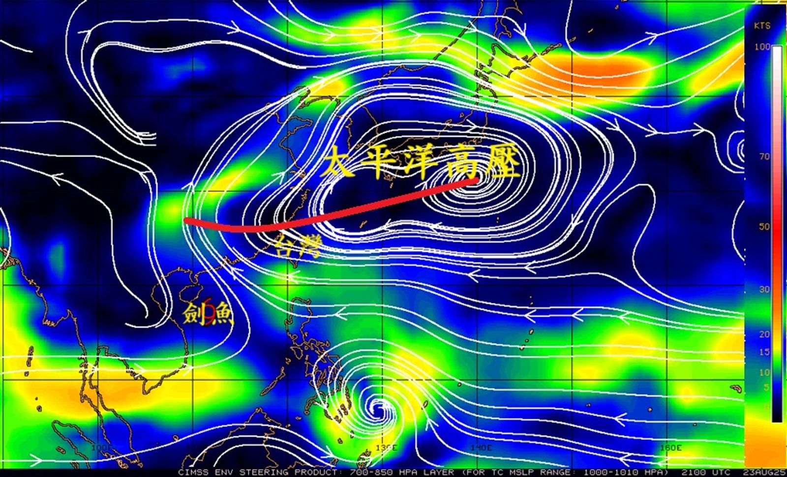 鄭明典今天也在臉書po文,指高壓軸線目前通過台灣北方海面,高壓往西延伸到陸地,顯示勢力強盛。北部地區因接近高壓軸線,天氣比南部更穩定,也更容易出現高溫。另一方面,劍魚颱風位於南海,同時菲律賓東側海面又有旋轉擾動發展,未來可能沿高壓南側往西進入南海,屆時低壓東側的潮濕帶恐將影響台灣天氣。