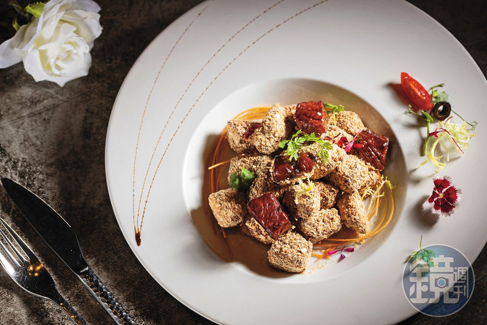 擁有新北第一粵菜稱號的「望月樓」,去年底迎來新任主廚邱龍俊,曾歷練於法式日料、中餐與餐酒館之間,師承香港名廚何慶輝,他學貫東西的經驗也反映在今年3月推出的幾道主菜中。「麥香摩卡和牛粒」融入新加坡兩大名菜「咖啡排骨」與「麥片蝦」元素,選用澳洲M9+黑毛和牛的去骨牛小排,搭配摩卡咖啡醬與奶香花生麥片,創造出咖啡味型與甘爽麥片平衡和牛脂香的獨特滋味。