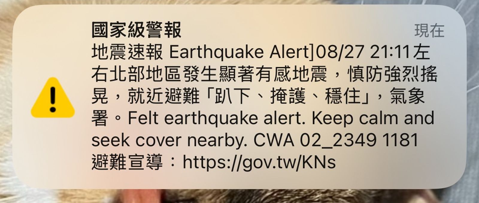 這起地震發生時,許多民眾手機同時跳出緊急警報通知,氣象署表示,21時11分左右,北部地區發生顯著有感地震,慎防強烈搖晃,就近避難「趴下、掩護、穩住」。