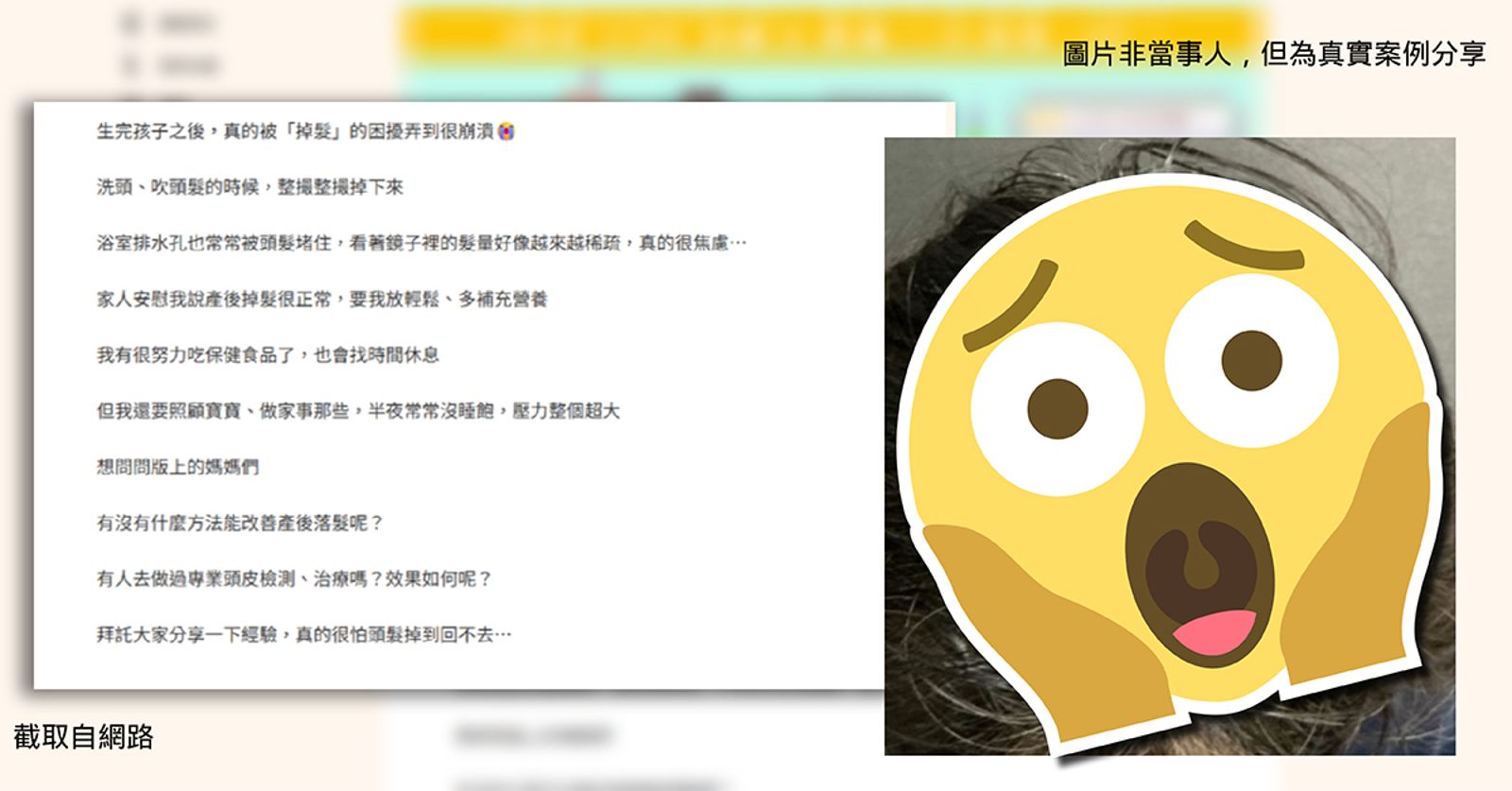女性在產後三至六個月常是掉髮高峰期,許多產後媽媽一邊適應育兒壓力,一邊還得承受外觀焦慮。近日就有一則求助文在網上引發熱烈討論,原PO媽媽一開頭就吶喊道,「生完孩子之後,真的被『掉髮』的困擾弄到很崩潰!」並指出洗頭、吹頭髮的時候,整撮整撮的掉甚至常讓浴室排水孔堵住,尤其看著鏡子裡自己稀疏的髮量直言,「真的很焦慮!」於是在網上求助其他媽媽的生髮、養髮秘訣,提問是否有人做過專業的頭皮檢測,好奇其治療效果。