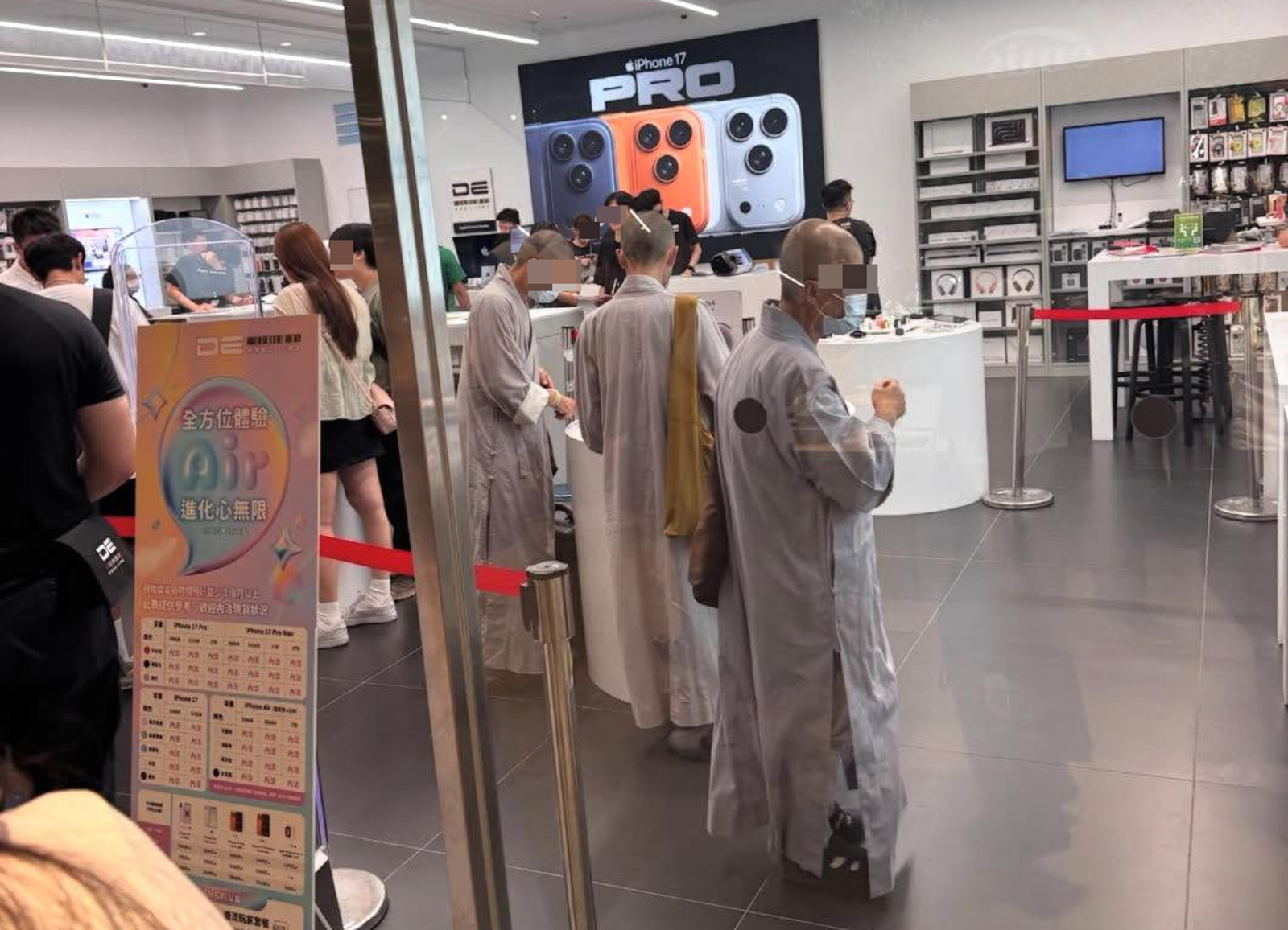 一名網友在臉書「爆廢公社公開版」分享一張照,可見有3名穿灰色僧袍、頭剃光、戴口罩的出家人出現在某蘋果專賣店內,其中兩人在新機展示區前端詳。店內擠滿顧客,牆上掛著斗大「iPhone 17 Pro」宣傳看板,出家人的出現格外引人注目。