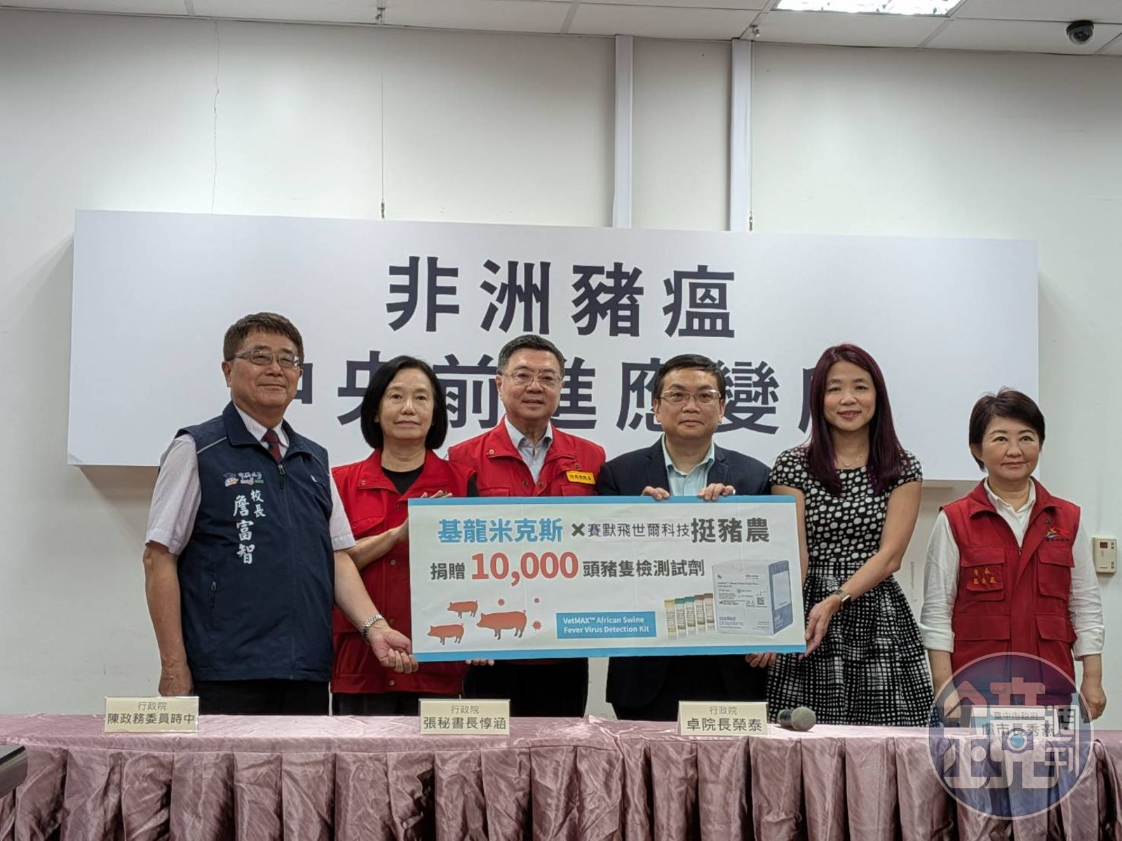 行政院長卓榮泰感謝基龍米克斯生物、台灣賽默飛世爾公司,免費捐贈1000支非洲豬瘟檢測試劑,讓疫調工作可以更快速進行。政務次長杜文珍表示,此檢測試劑,經過世界動物衛生組織和歐盟實驗室認證,好處是縮短很多時間,一次可以同時做10個豬隻測試。