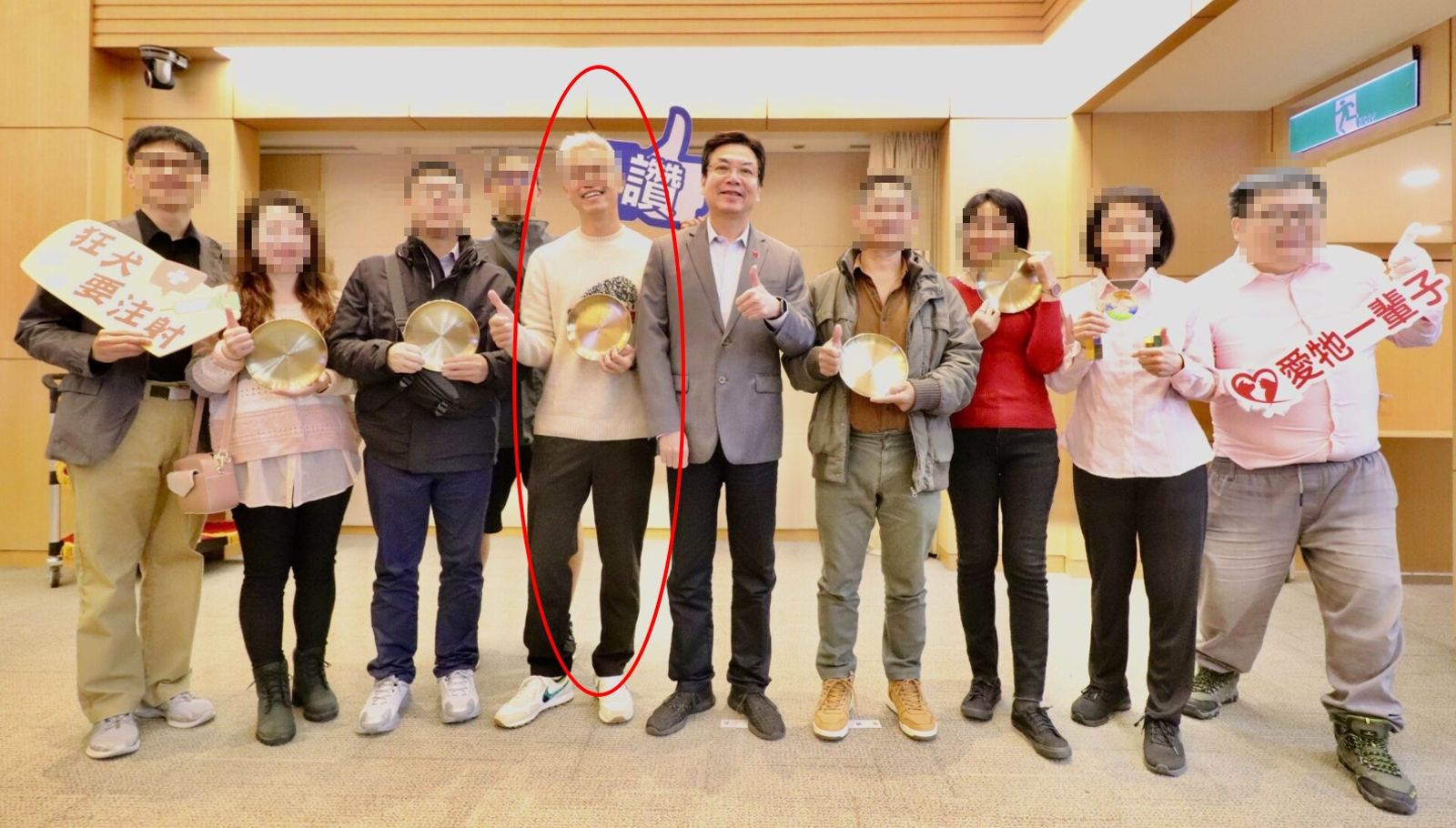對柯基犬施暴的詹姓男子(紅圈處)曾獲新北市副市長劉和然頒發「金飯碗」表揚其為模範飼主。(翻攝自新北市動保處)