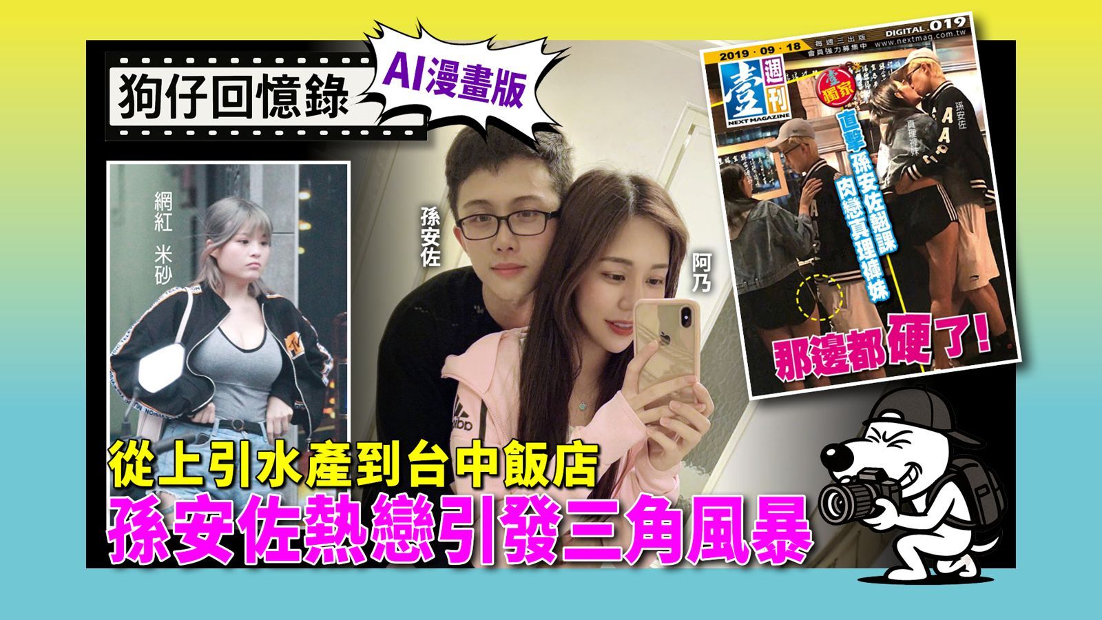 藝人孫鵬和狄鶯之子孫安佐在美國唸書鬧出大風暴之後,2019年轉回台灣唸書。《壹週刊》狗仔記錄孫安佐返台後的感情風波,跟拍中直擊他與女友阿乃在上引水產親密互動,隨後兩人突赴台中入住金典酒店三天幾乎未外出,引發揣測。面對記者採訪,孫安佐態度強硬,承認交往但否認久居房內。之後網紅米砂自爆為他墮胎,與阿乃互控第三者,三角戀引爆網路輿論,成為2019至2020年話題高峰。