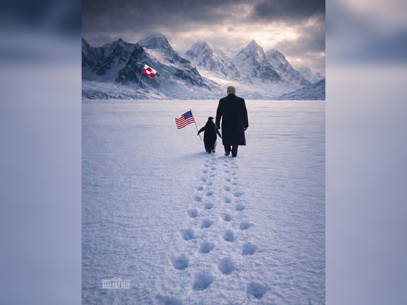 白宮是台北時間今日凌晨在X平台貼出一張AI合成照片,上面顯示白皚皚的雪地上,看似川普背影的男子牽著一隻企鵝同行,走向冰雪覆蓋的山脈,企鵝還手持美國星條旗,象徵已經歸順,遠方則插著一支格陵蘭旗幟,白宮並發文寫到「擁抱企鵝」(Embrace the penguin)。