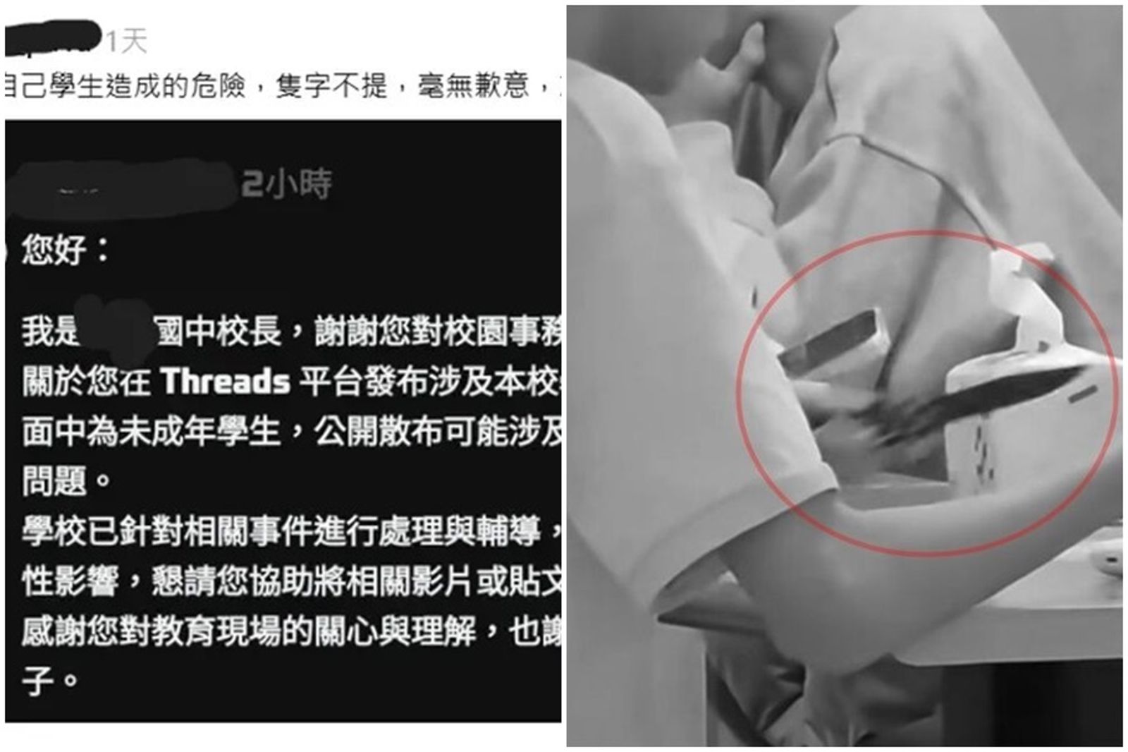 對此,引發爭議的國中生學校的校長也現身留言,「關於您在Threads平台發布涉及本校學生之影像內容,因畫面中為未成年學生,公開散布可能涉及學生隱私與人格權保護問題。學校已針對相關事件進行處理與輔導,為避免對學生造成持續性影響,懇請您協助將相關影片或貼文刪除或下架。」