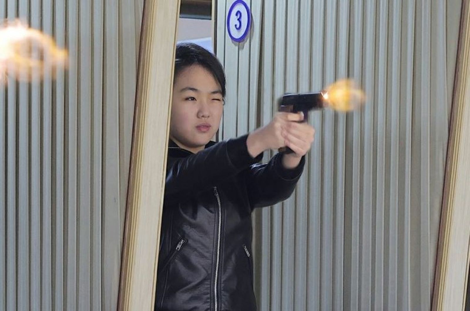 雖然文字報導中沒有提到金主愛,但官方發布的照片顯示,金主愛現身射擊場,穿一身黑色皮衣,與軍方高層一同試射手槍。她手持武器,神情專注扣下扳機,槍口火光瞬間噴出。