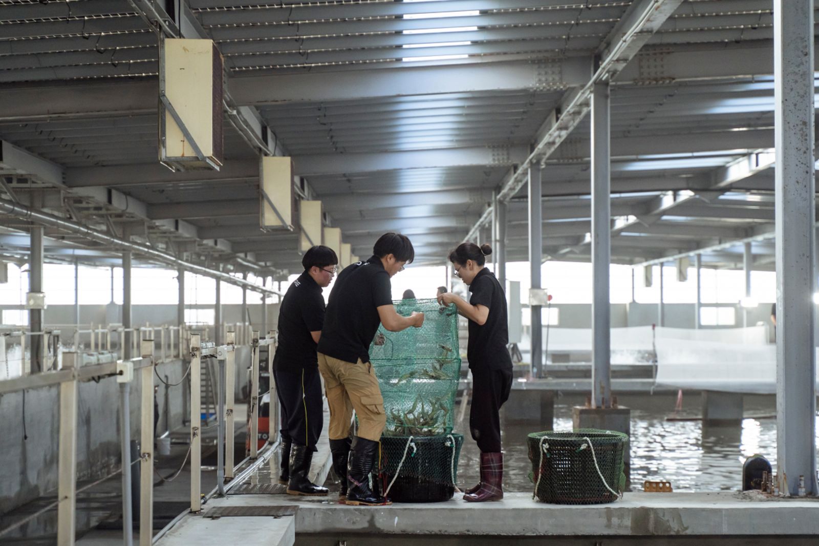 日運案場採戶外與室內並行的多元養殖模式,戶外池養殖烏魚與虱目魚,並混養白蝦維持池底生態平衡;其中烏魚每年投入約14至15萬尾,透過益生菌養殖管理優化水質,並於年底加工製成烏魚子,提升產品附加價值。室內設施則導入高密度白蝦養殖,每年投入約270萬尾白蝦苗,結合生物絮團技術,建立穩定且具韌性的養殖環境,有效降低氣候變動風險。全數漁產品皆取得產銷履歷認證並符合臺灣良好農業規範(TGAP),同時已申請並通過多項養殖相關技術專利,涵蓋養殖結構與捕撈系統等,持續優化養殖效率與管理能力。