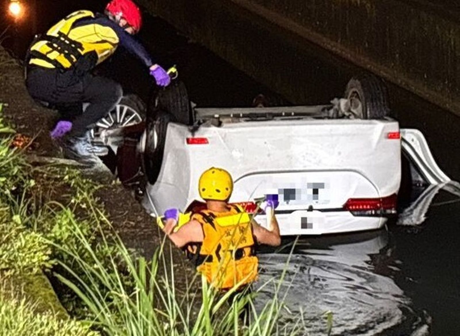 這起事故發生在昨日晚間,吳姓女子駕駛白色自小客沿慈航三路東往西方向行駛,不明原因突失控撞上電線桿,由於撞擊力道猛烈,白車墜入一旁大排翻覆。警消獲報到場,發現吳女受困四輪朝天的自小客車內,緊急將她救援上岸,不過,吳女雖然沒有外傷,但疑似溺水太久,被發現時沒有生命跡象。
