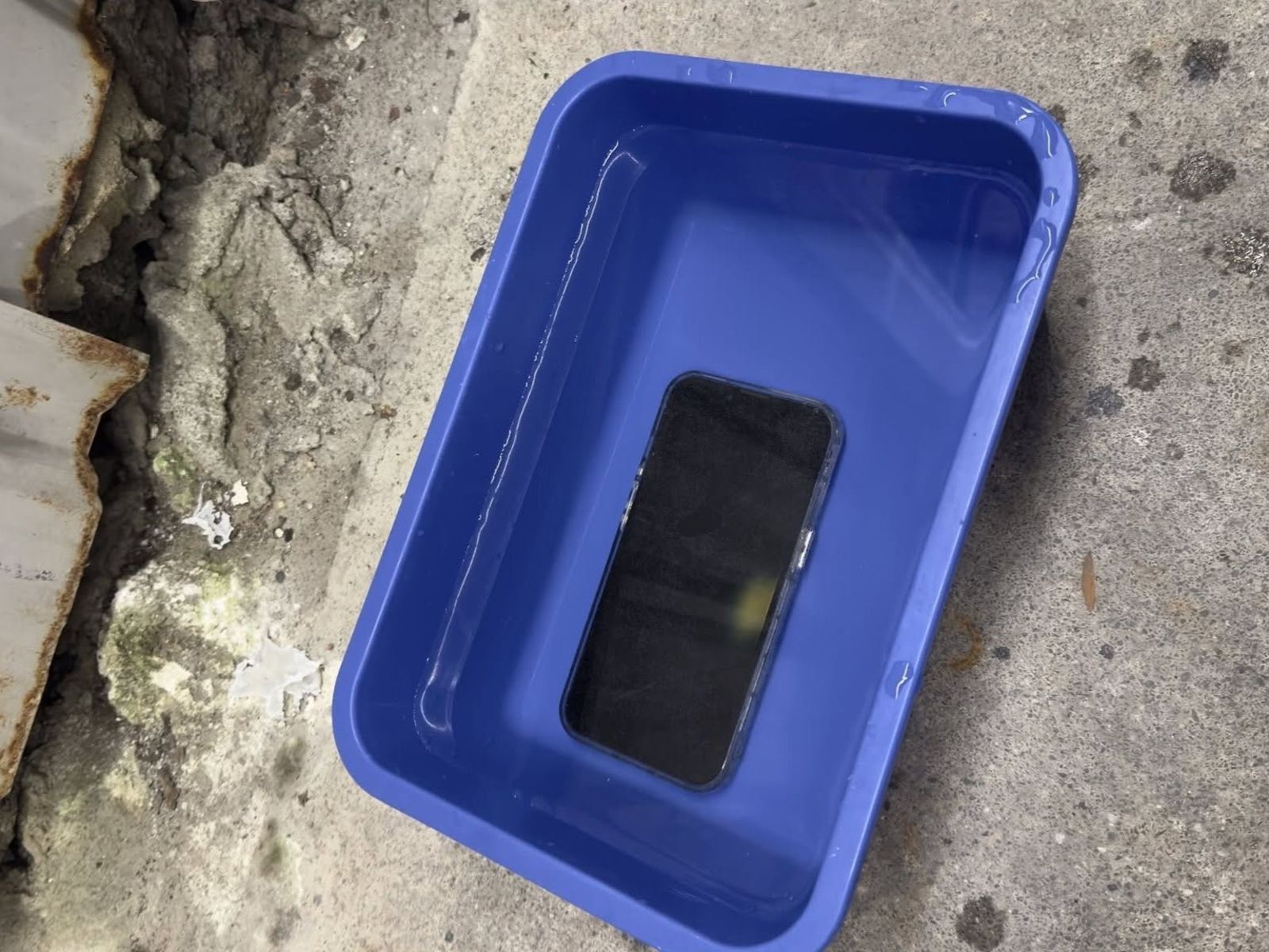 一名網友日前發現手機冒煙,便立刻將手機放水中浸泡,防止後續爆炸燃燒。(翻攝Threads@ya.kani)
