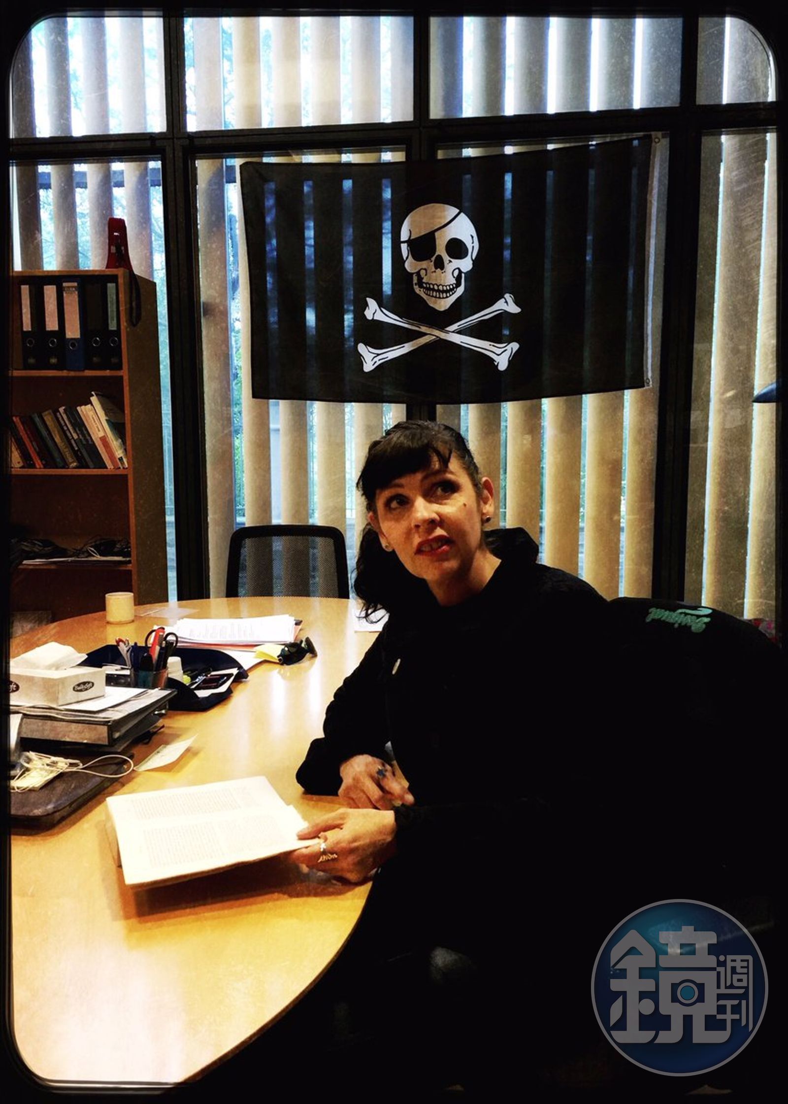 這個黨叫做冰島海盜黨(Icelandic Pirate Party),他們的國會辦公室牆上掛著一面黑色海盜旗,上面繪有一顆白色骷顱頭和兩根交叉的人骨。