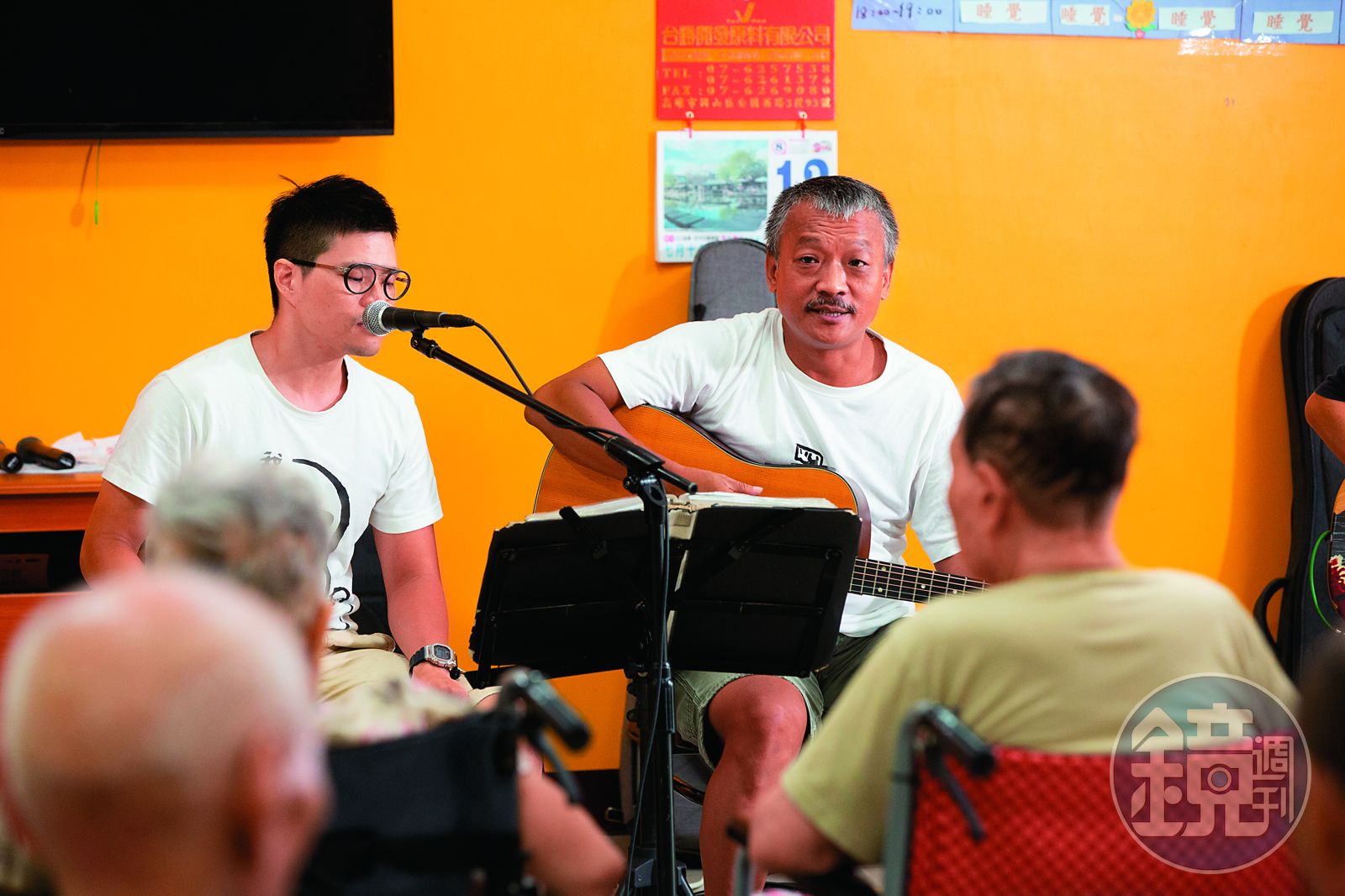 8月中旬,南臺灣清晨一場暴雨襲擊,許多機關單位一早就公布停班的消息。這天,謝銘祐的「麵包車樂團」預計到歸仁安養中心義演,原以為也會喊停,沒想到樂團不畏風雨依約前往,照著既定安排,為安養中心的老人們唱了十幾首歌曲,除了開場應景唱了2首和雨有關的歌,接下來的表演全配合長輩們的年代,有思念的、熱鬧的,也有飽含情愫的歌曲,雖看不出台下孱弱的長輩們反應如何,但臺上的謝銘祐和樂團夥伴可是越唱越起勁。