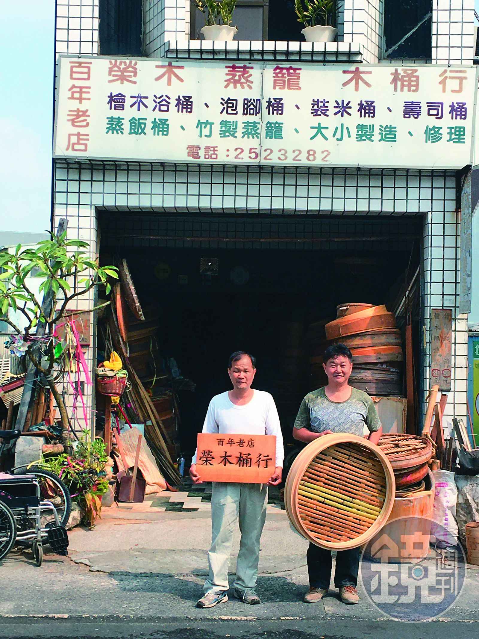 因日曬雨淋而斑駁的招牌,並不會讓人忽略榮木桶行的存在。通常老闆兄弟倆一前一後工作,站在店門口,就能聽見搭配工作的復古歌曲,定睛一看,便可全覽整間狹長的店面,兩旁的木製蒸籠、各式尺寸的木桶、以及靠牆而立的木片竹片堆疊到天花板。走進店裡,不會聞到加工的漂白水味,弟弟王炳文強調他們的產品絕對純天然,雖然初見賣相不佳,但經過時間考驗後,便會感受到它們的香味與耐用度。