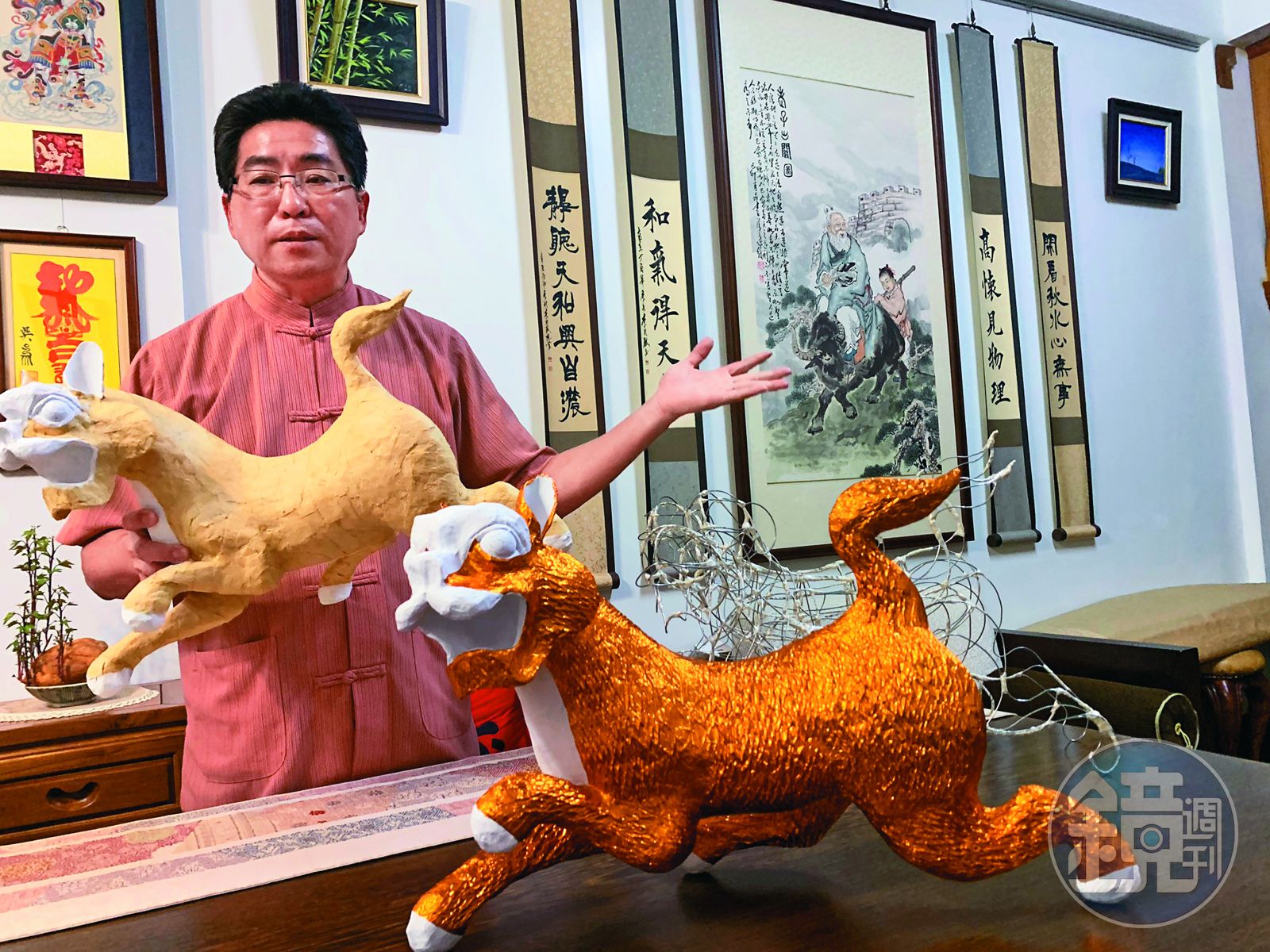 走進吳文進法師位於學甲區新榮里的工作室,門口擺放了各式各樣神獸胚形,用手觸摸堅厚紮實,沒有說明,還真不知道這些都是紙紮作品,技法高超令人咋舌。
