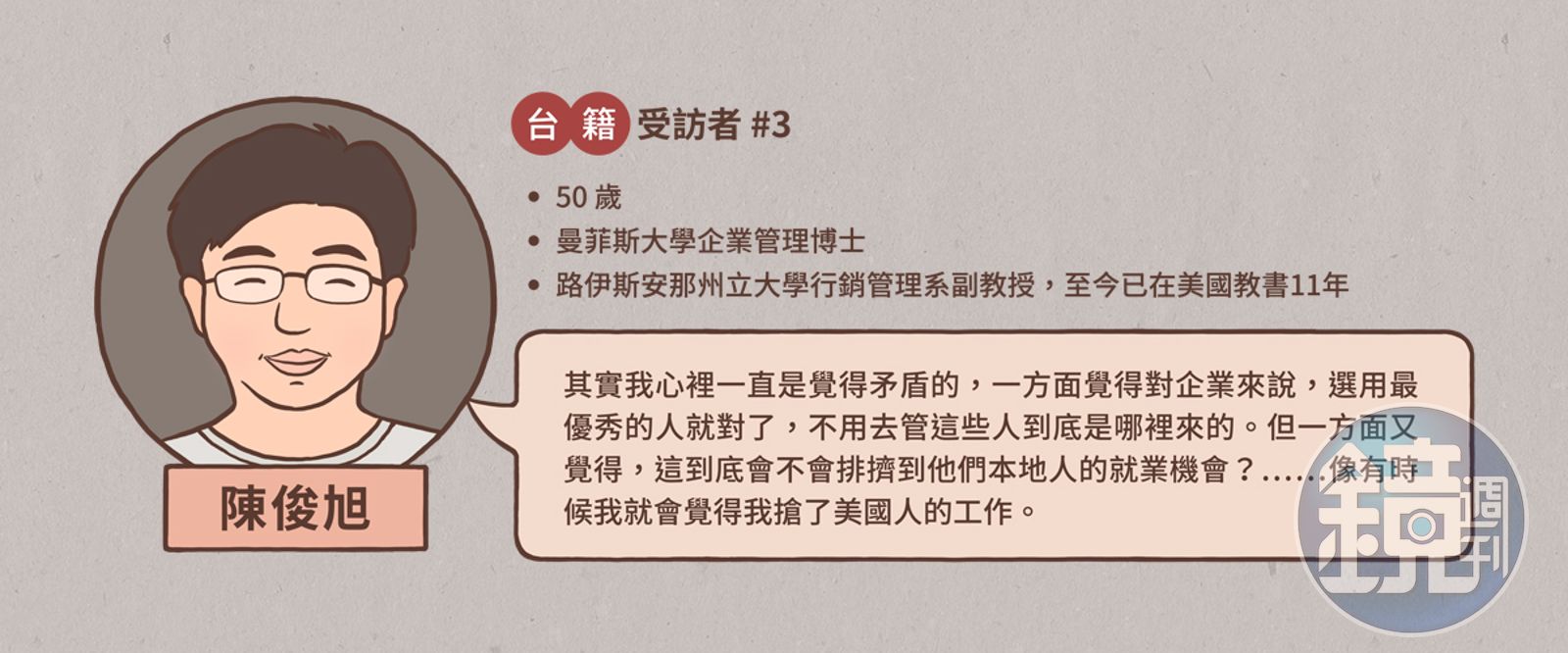 雖然在學校教授國際企業管理,陳俊旭心裡明白,對企業來說,爭取優秀人才天經地義,如果政府處處都要保障本國籍人才,對企業競爭力來說絕對是阻礙。然而,他對於當地人尋職不易,卻又充滿同情。他認為,美國的移民政策,很傷害底層的黑人和少數族群,對於人才輸出國來說,也是一種傷害。