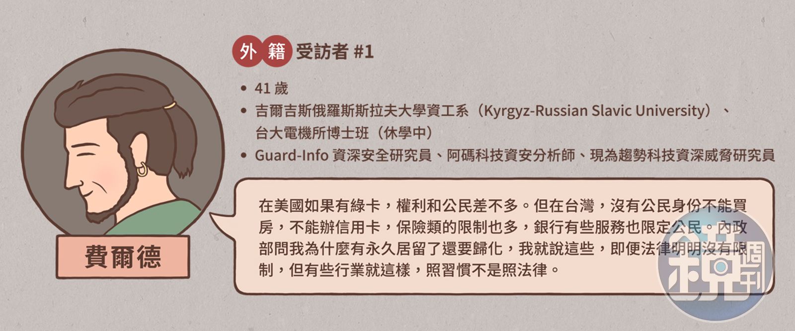「現在新的法律,是我可以先拿到台灣國籍,而且高級人才也不用放棄原國籍就可以歸化,所以我才有辦法拿台灣國籍。可是他們(指政府官員)處理事情都很保守,他們說我通過後,會是第一個案子,很多事情不知道怎麼處理……所以雖然有法律,但他們怕會成為漏洞,所以一開始不許可。後來我還是找了科技部、立委幫忙,才讓事情比較順利。」